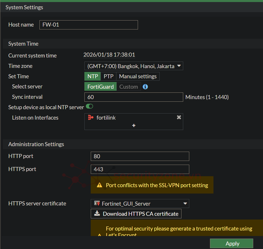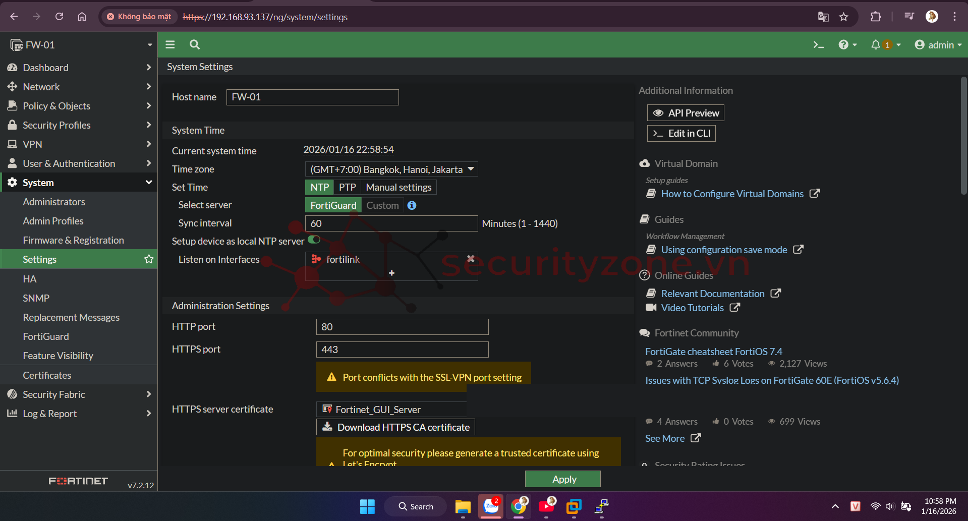 Để đảm bảo các sự kiện hệ thống được ghi lại chính xác theo thời gian thực, tiến hành cấu hình múi giờ (Time Zone) là GMT+7. Thiết bị được thiết lập đồng bộ thời gian tự động với máy chủ FortiGuard qua giao thức NTP với tần suất 60 phút/lần.