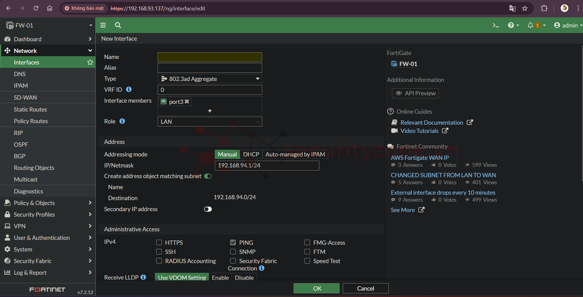 Tiến hành cấu hình Aggregate Interface (LACP) trên port3 (vì port2 đang chạy DHCP). Việc cấu hình này thiết lập sẵn khung hạ tầng logic (Logical Interface), cho phép hệ thống dễ dàng mở rộng băng thông bằng cách thêm các cổng vật lý khác vào nhóm (ví dụ port4, port5) trong tương lai mà không cần thay đổi cấu hình IP hay Policy của mạng LAN
