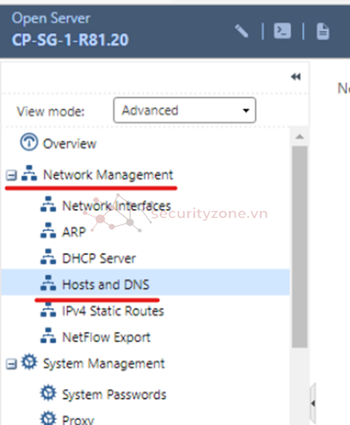 Trong giao diện Web GUI, vào menu bên trái: Network Management > Hosts and DNS