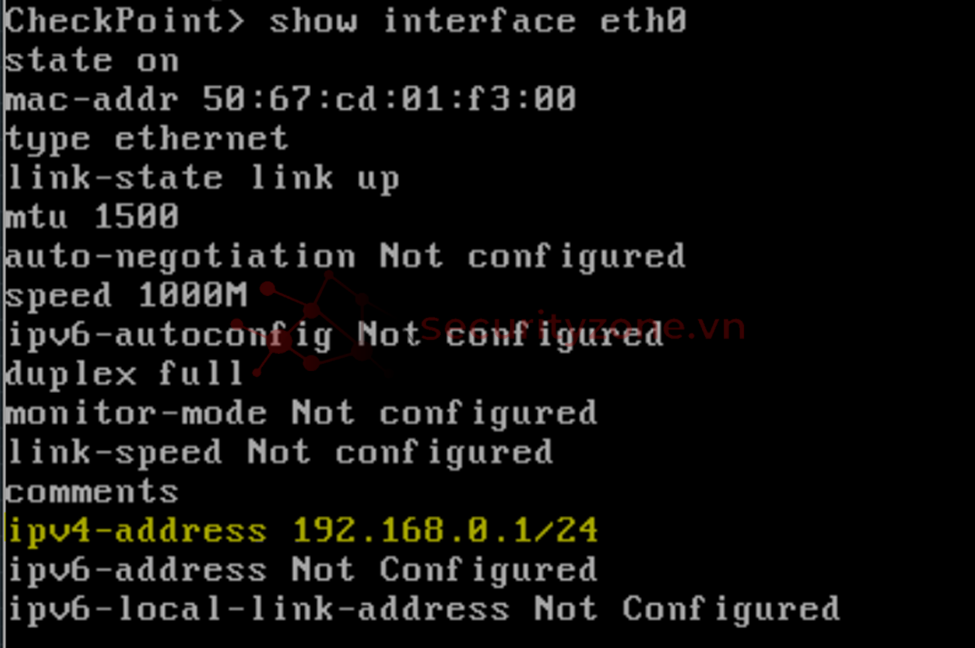 - Trên CheckPoint, kiểm tra IP của port eth0 để từ đó có thể truy cập đến Web UI của CheckPoint.