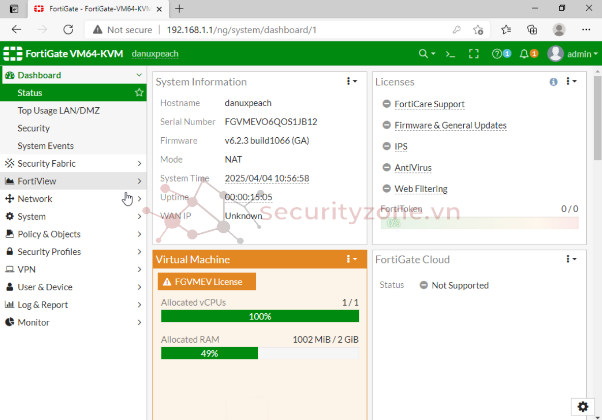 Khi đăng nhập thành công thì do đã đổi mật khẩu trước đó nên Firewall Fortinet sẽ không yêu cầu nữa, và có gợi ý đặt Hostname nên ở đây mình đặt luôn.