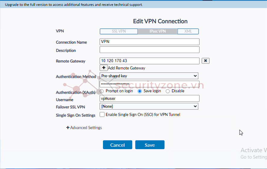 - Ở đây mình đã tạo rồi nên sẽ chọn edit (new sẽ tương tự) với remote gw là ip wan của Fortinet và pre-shared key sẽ là vpn123456 như nãy mình tạo