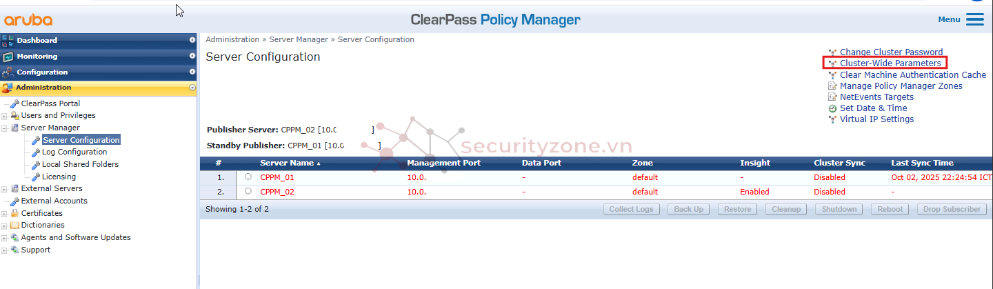 Bước 1: Trong CPPM của Publisher, đến Administration > Server Manager > Server Configuration, sau đó chọn "Cluster-Wide Paramaters":